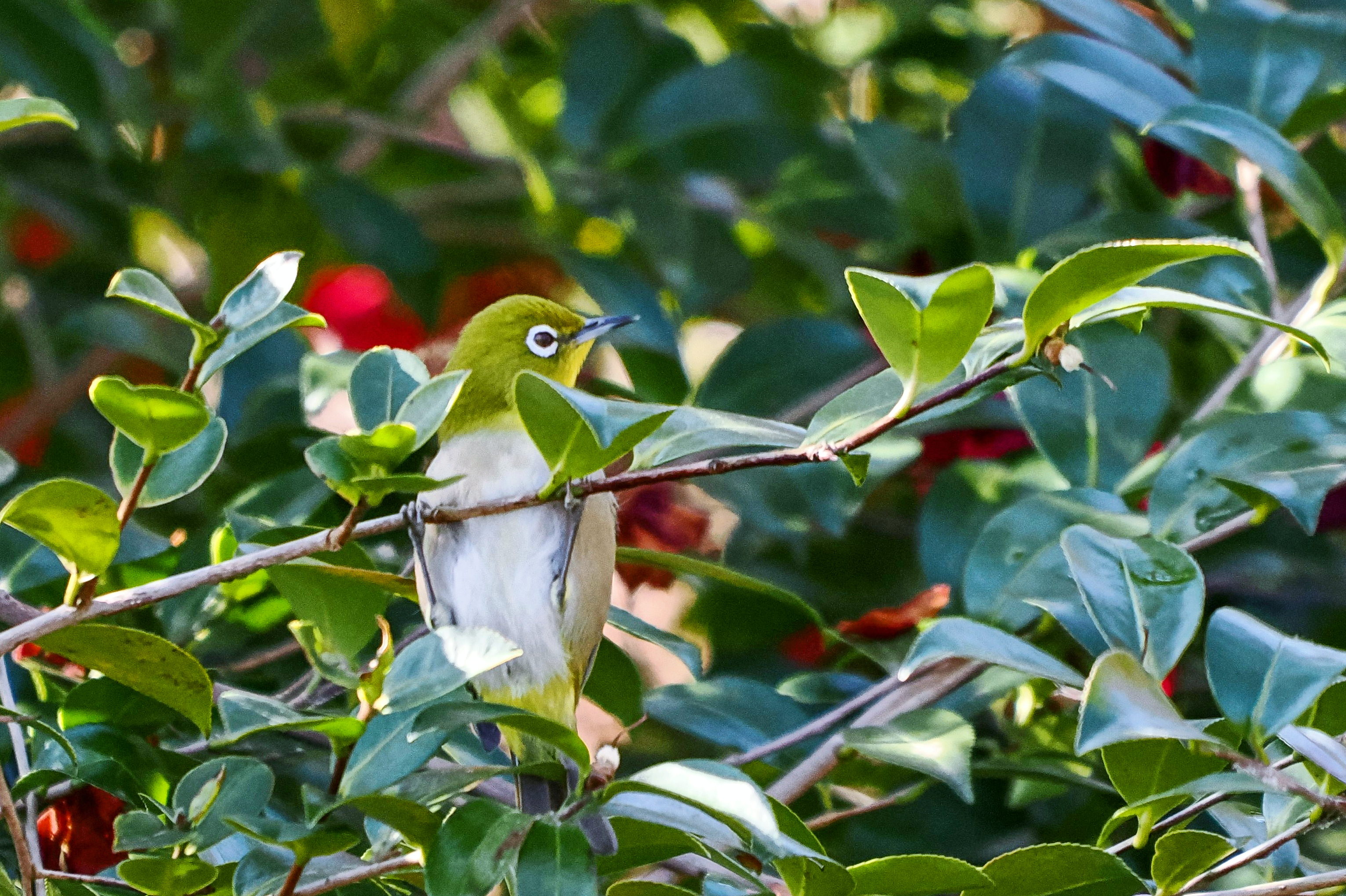 蜜を吸える花が殆んどなくなってしまった山茶花。メジロくんは懸垂をしました。