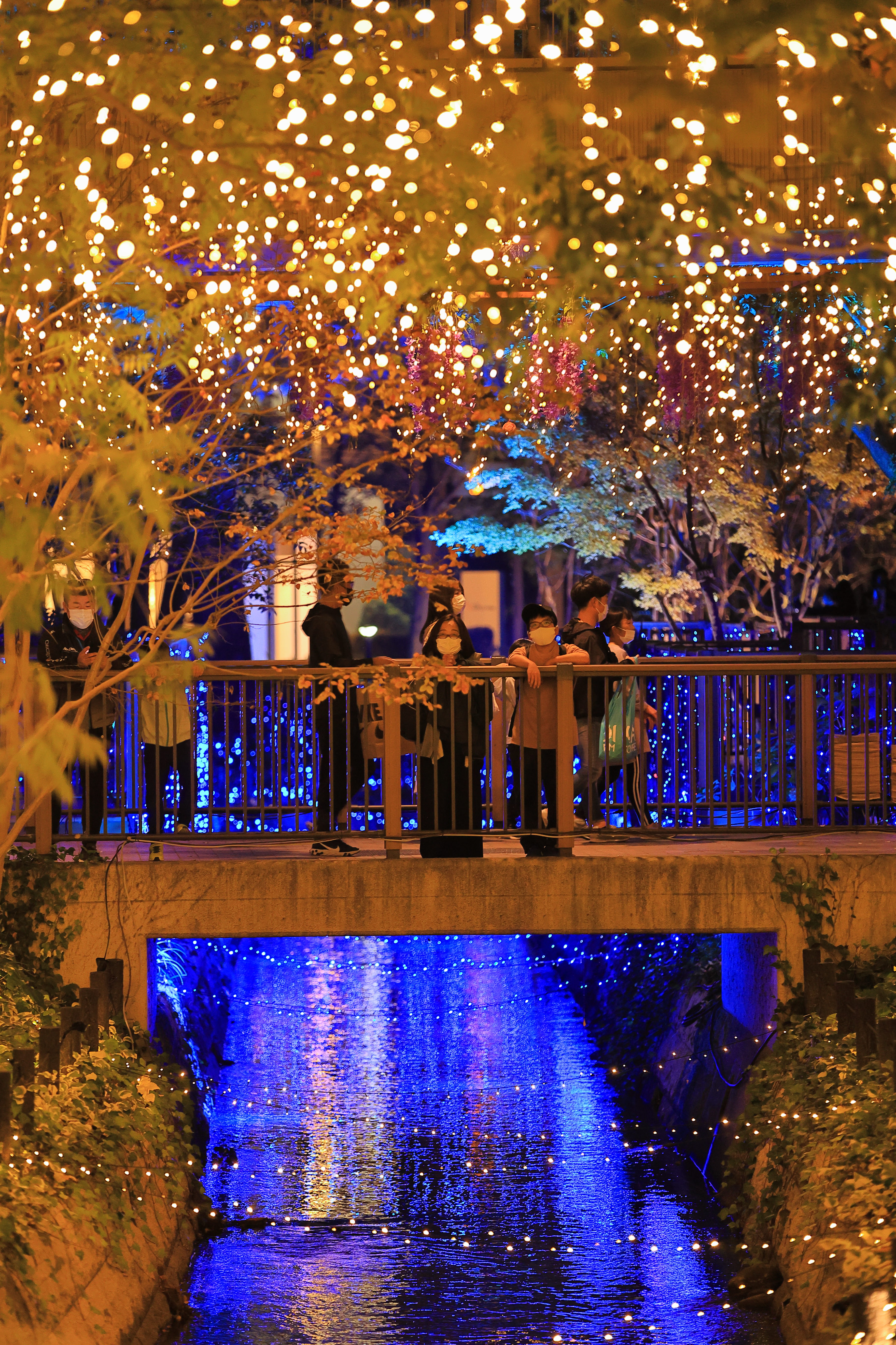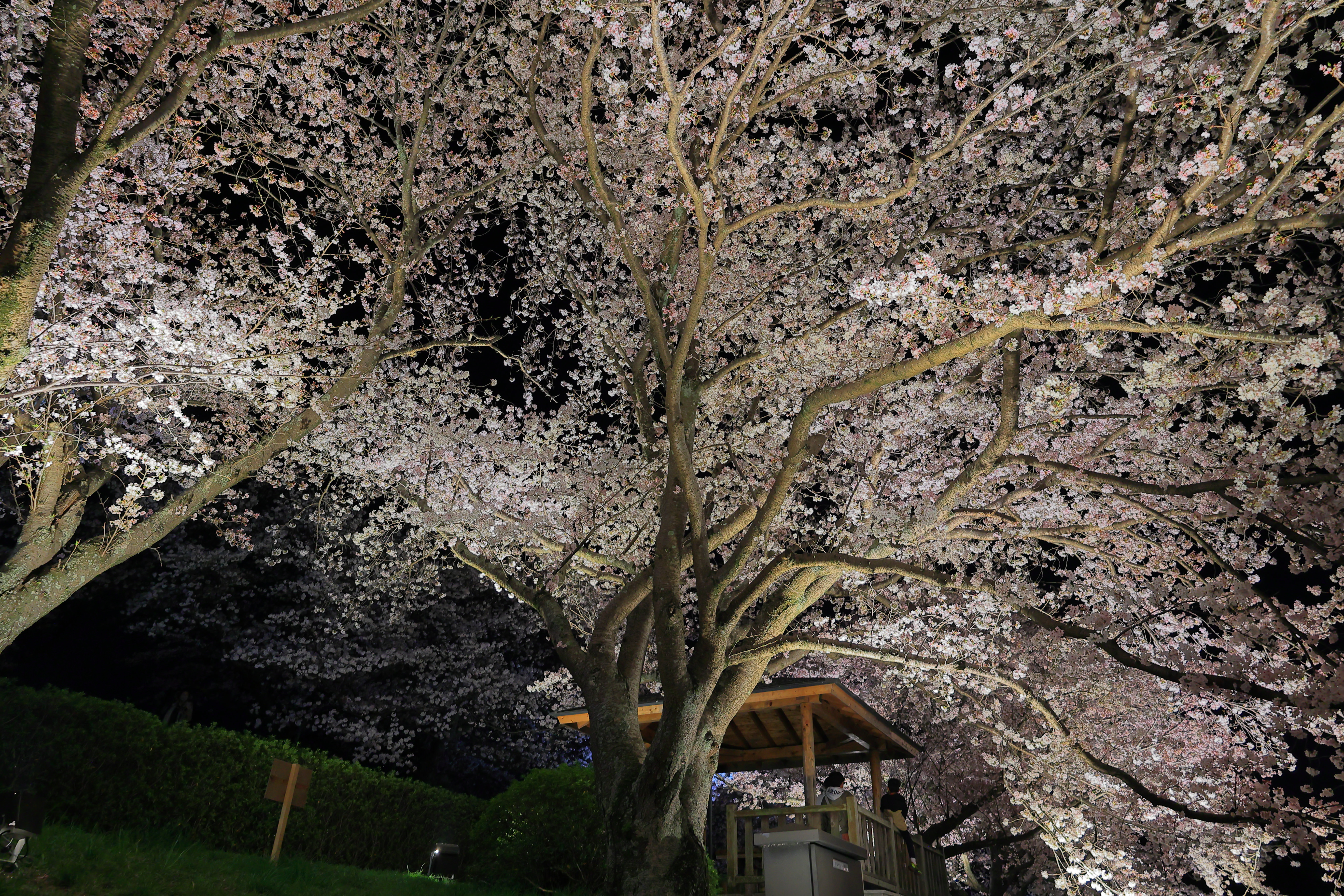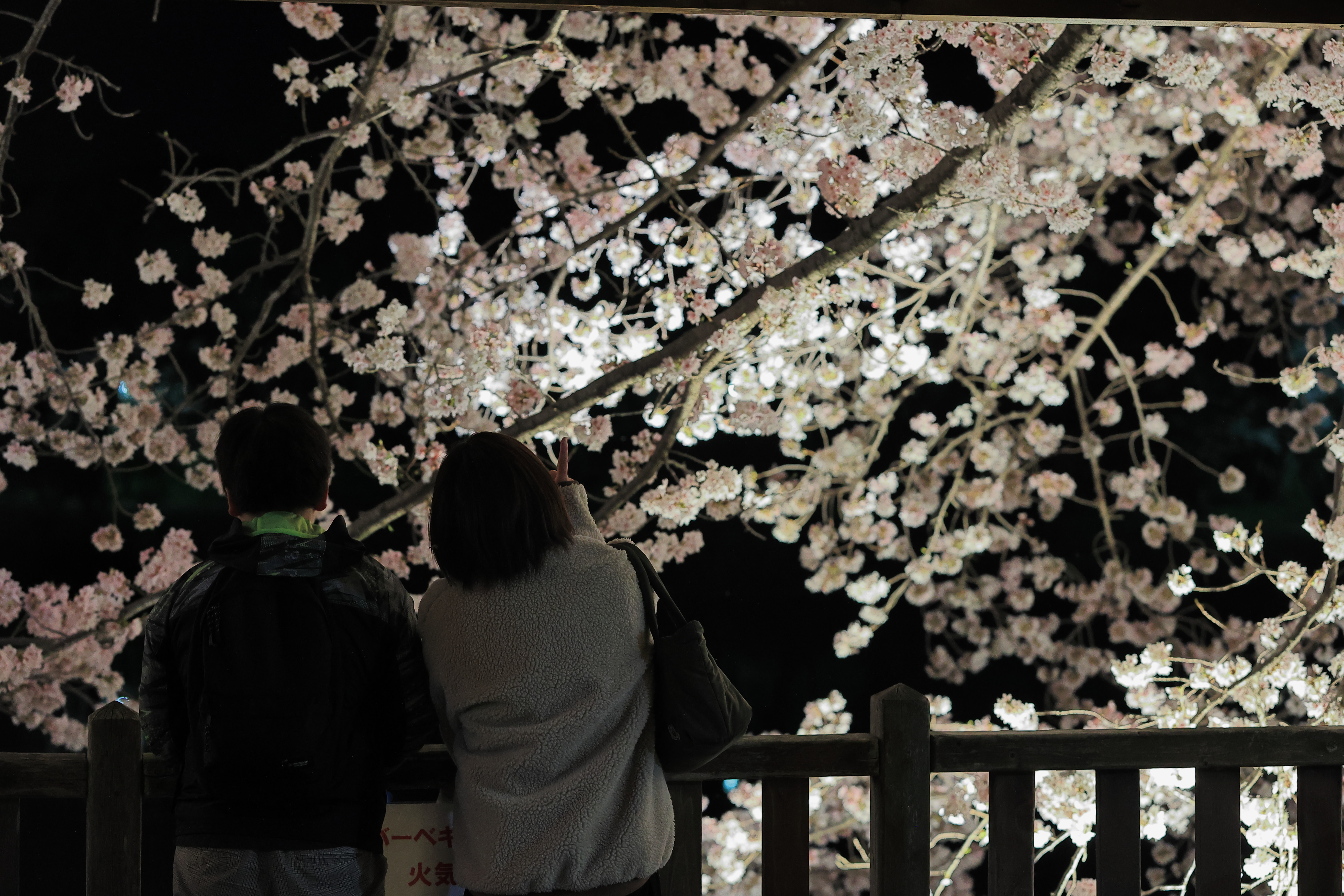 綺麗にライトアップされてる夜桜を見てる様子を撮りました。