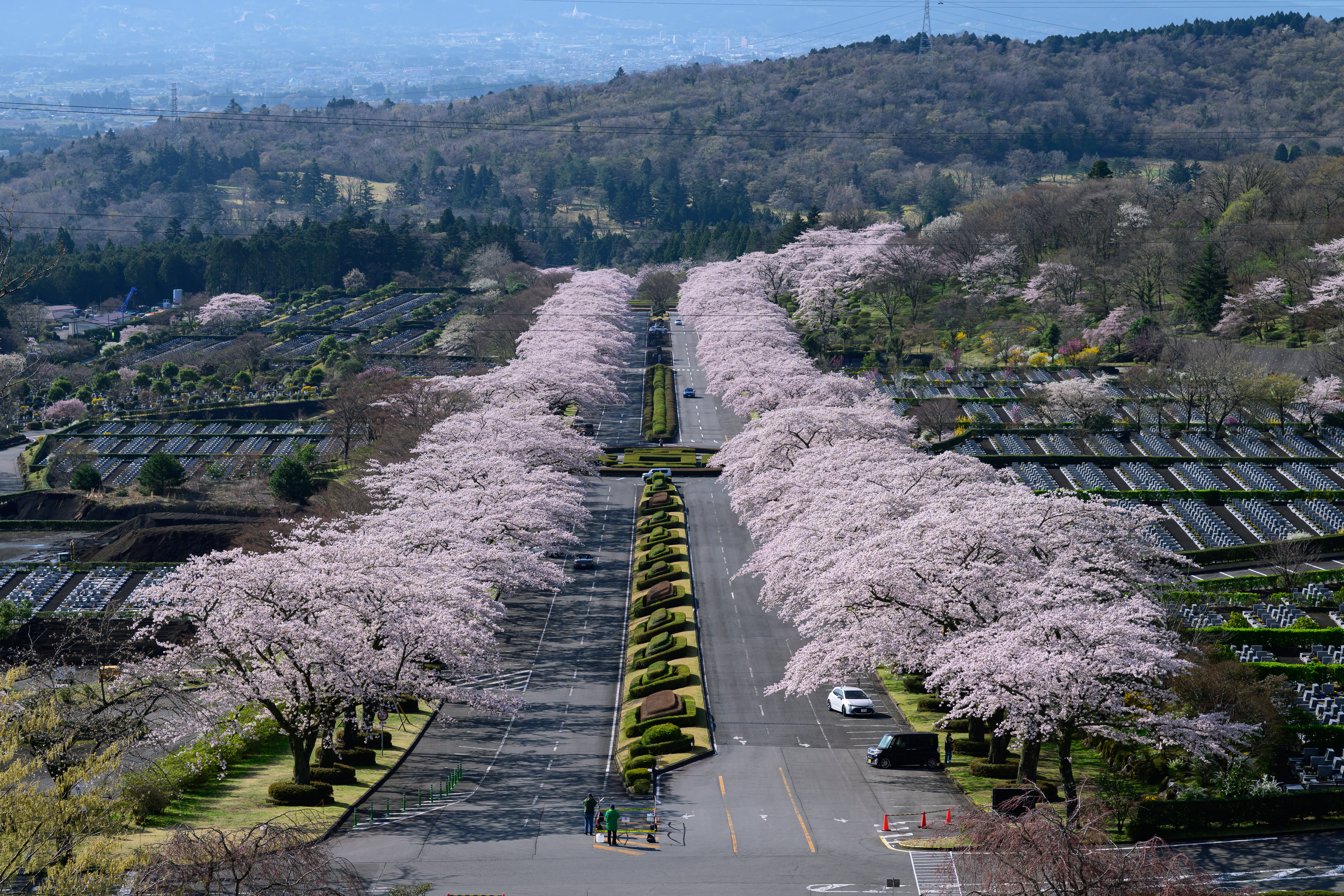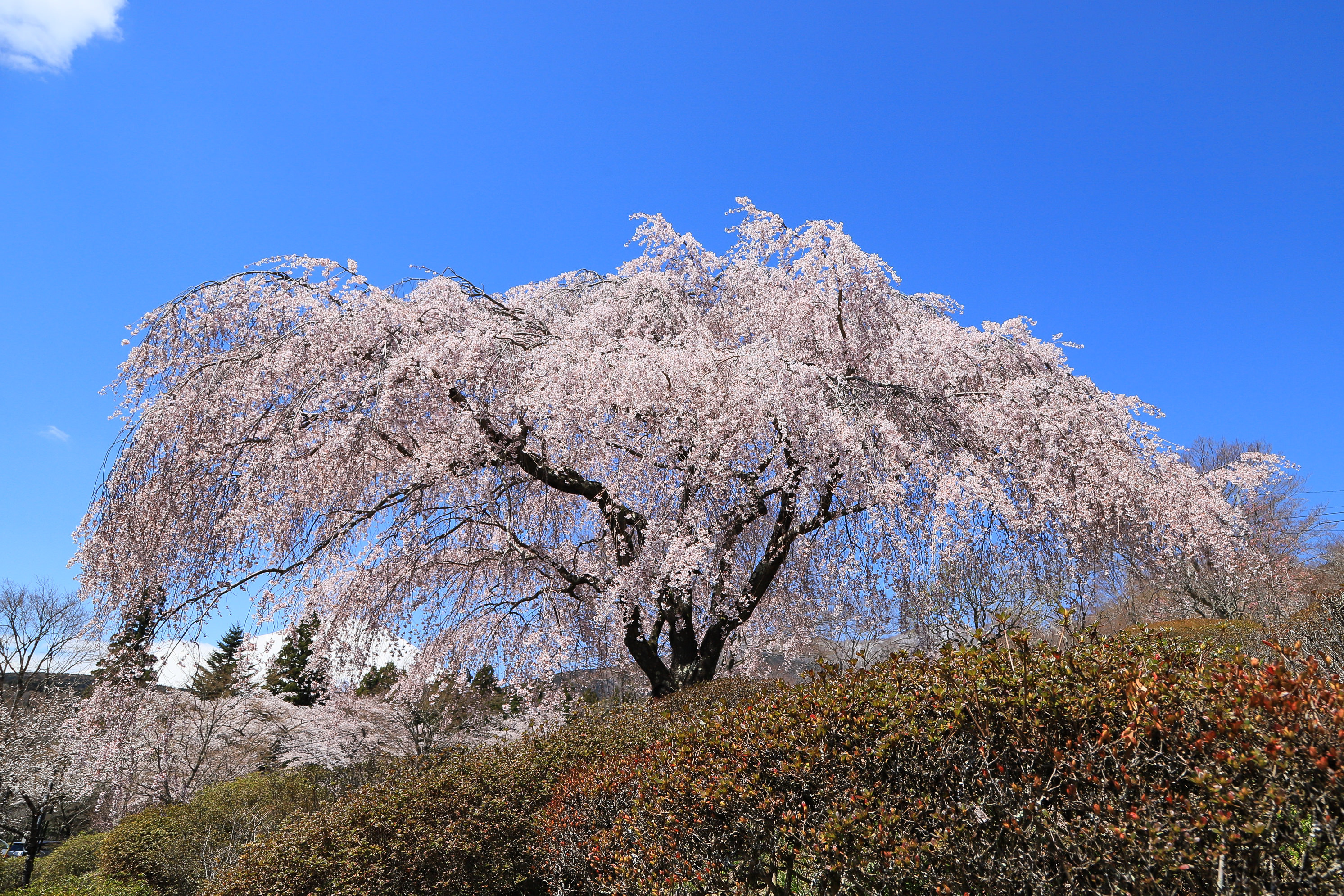 霊園の片隅にある枝垂れ桜の木。見事な桜なのですが場所柄あまり人もいませんでした。背景には富士山が小さく写っていますが、余りの桜の美しさに主役は桜の木となりました。