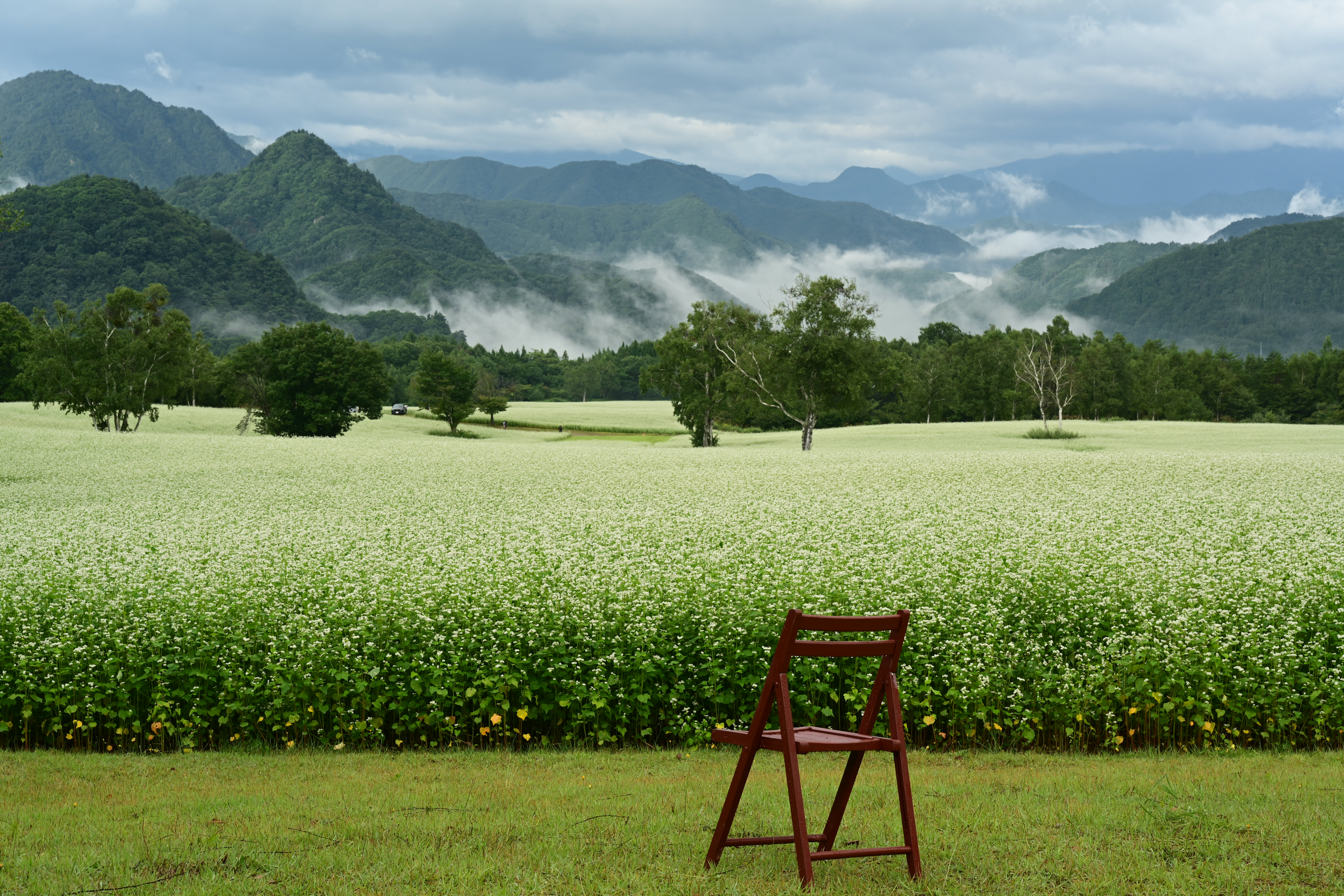 曇りでもそば畑と山々がいい感じに撮れました。次はだれかに座ってもらいたいがいつになるやら。