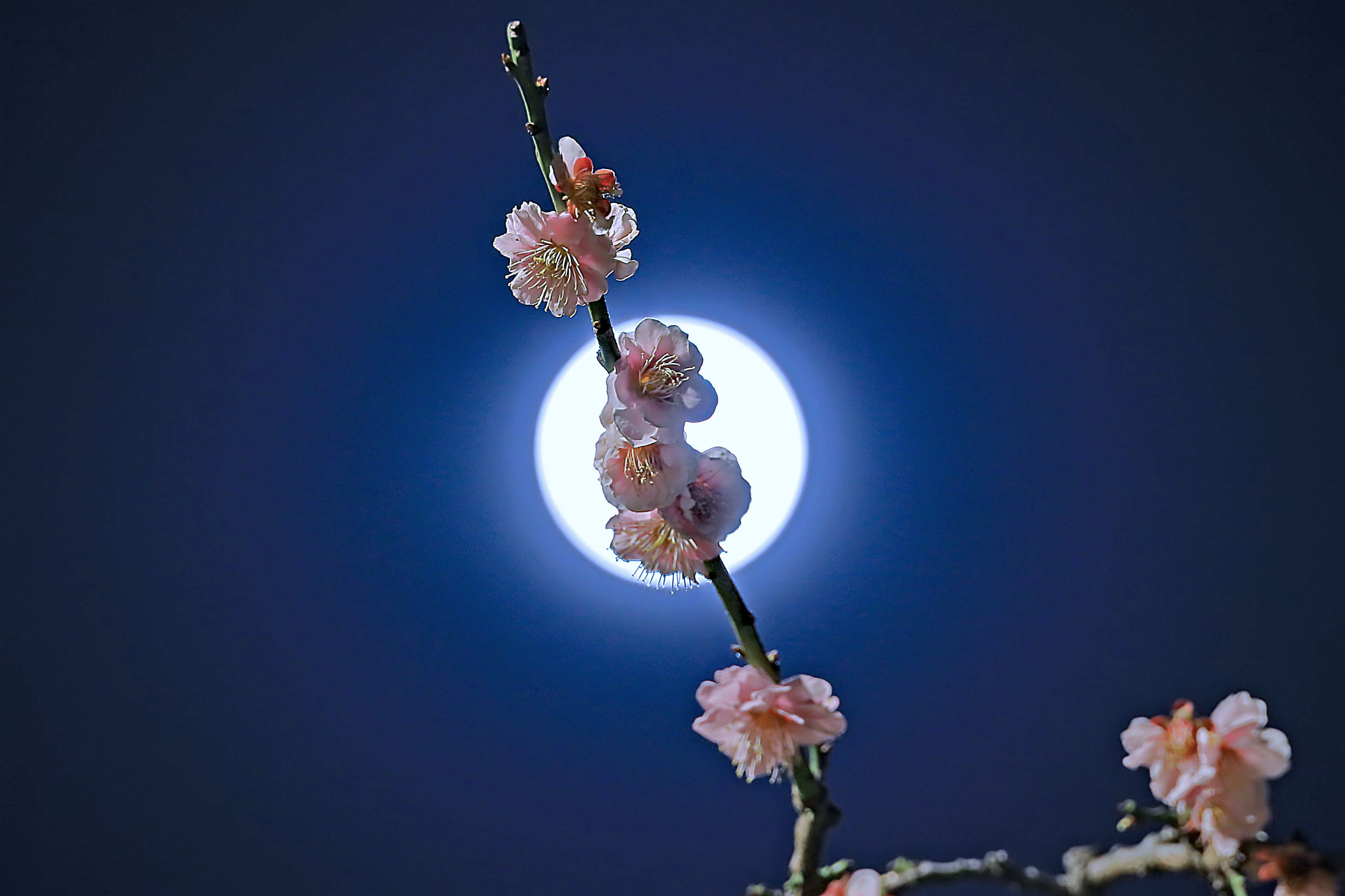 大阪城公園の梅林で写した満月の夜の紅梅です。