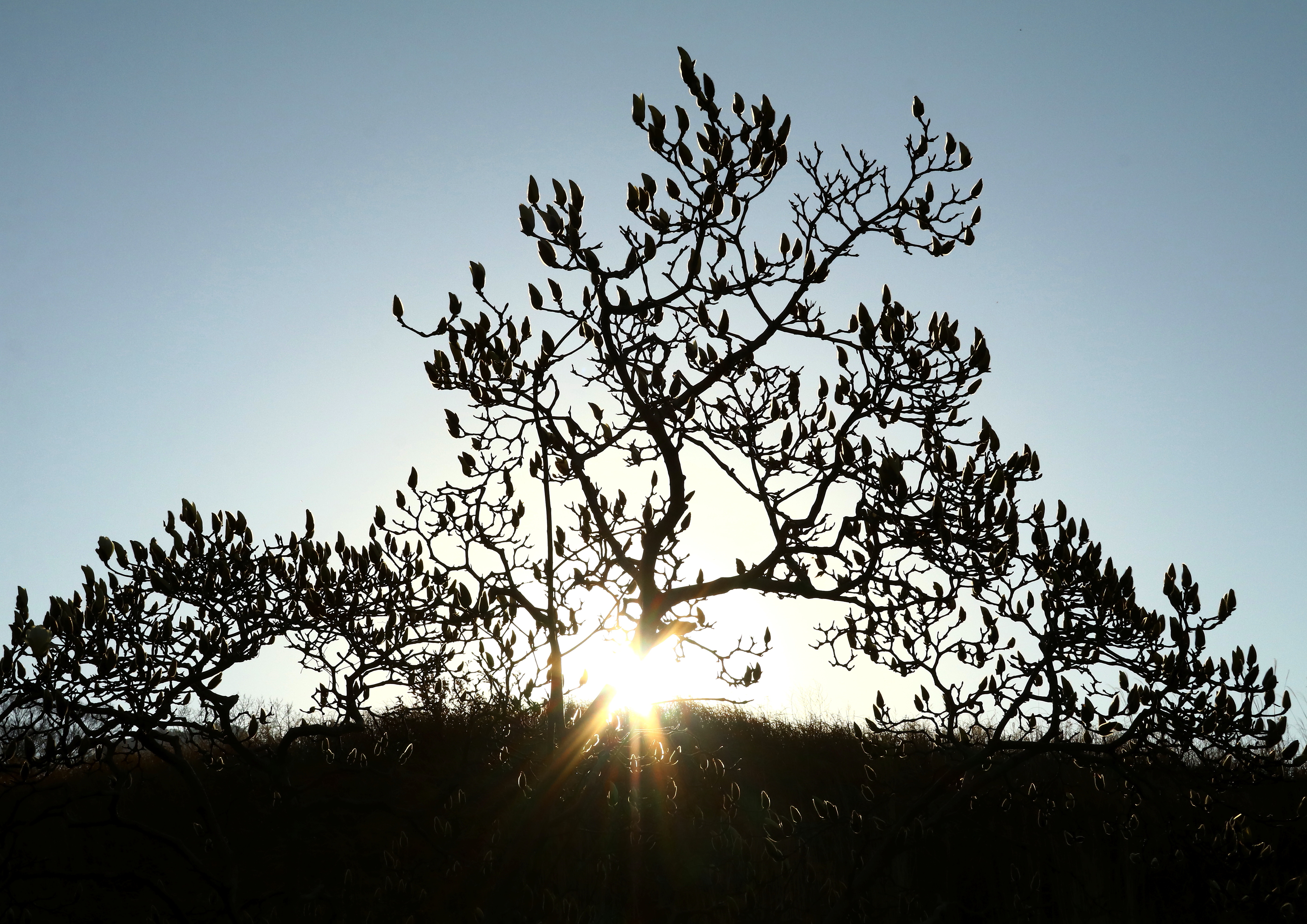 池の土手下で開花をまつ、モクレンの枝。朝日が差し込んだ数分を逆光で撮る。白モクレンを黒モクレンにする。