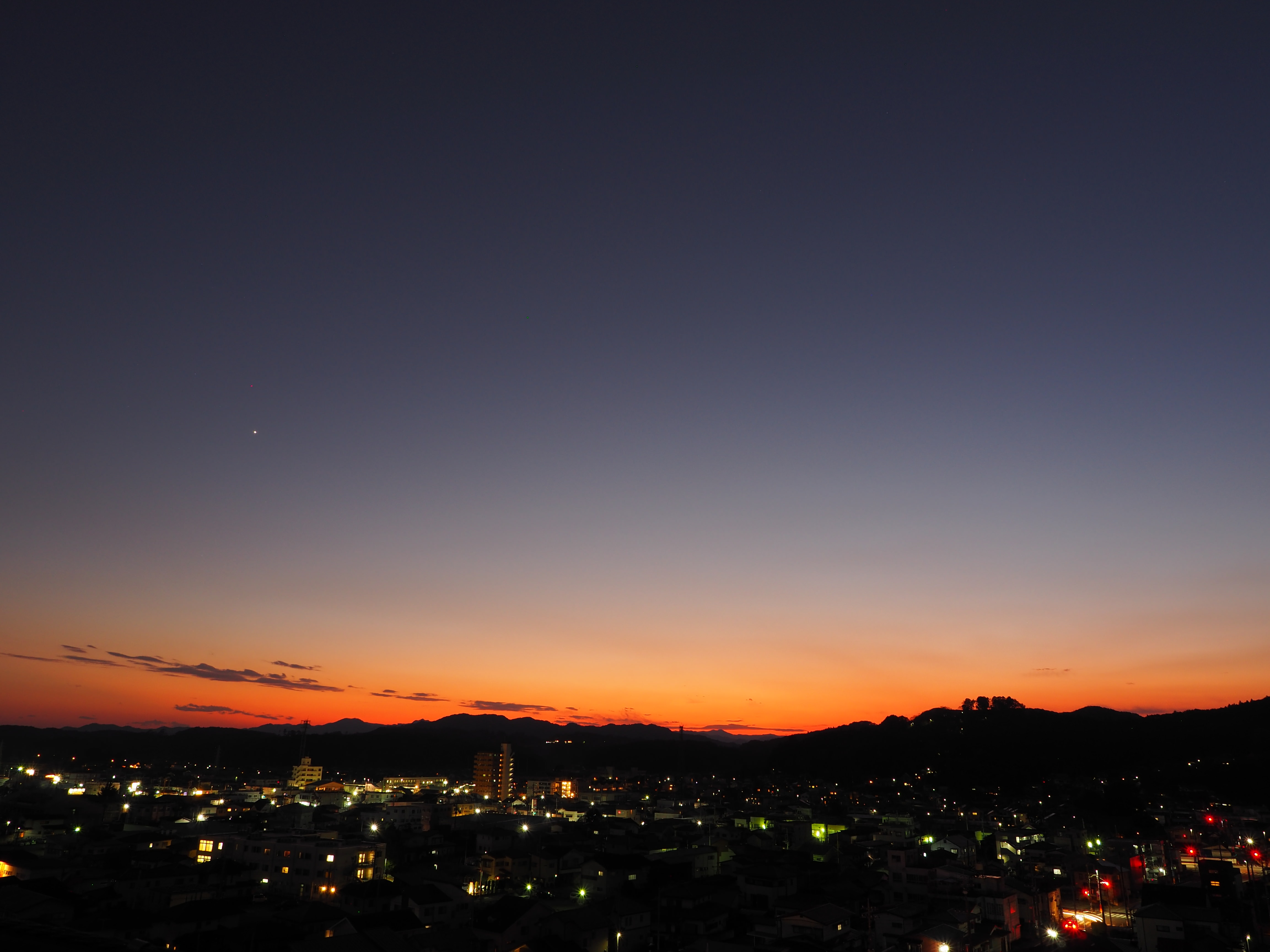 撮ってるときは夕焼けがきれいだなーくらいにしか思ってませんでしたが、今見返すと小さく宵の明星が写ってました(笑)